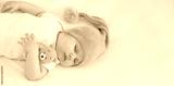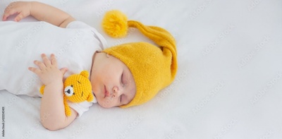 A child in a white bodysuit is sleeping on a white background, hugging a small yellow teddy bear