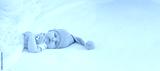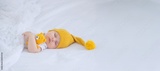 A child in a white bodysuit is sleeping on a white background, hugging a small yellow teddy bear