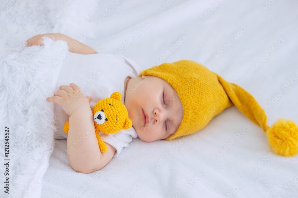 A child in a white bodysuit is sleeping on a white background, hugging a small yellow teddy bear