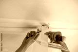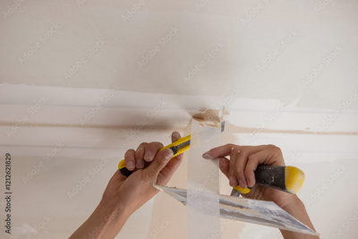man plastering ceiling, repair. Selective focus