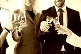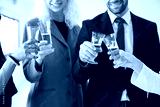 close up businesspeople clinking glasses and celebrating have a drink after work in the office