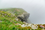 Pink thrift flowers blossoming on the Cliffs of Moher, one of the most popular tourist destinations in Ireland. Foggy view of widely known attraction on Wild Atlantic Way in County Clare.