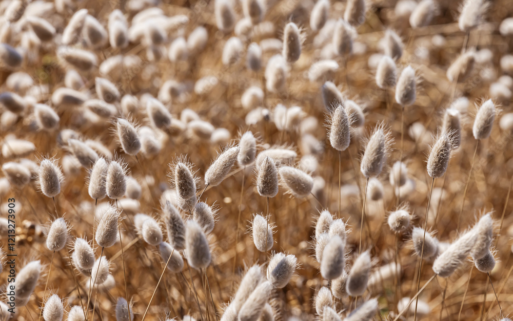 Delicate, fluffy dry grasses sway gently in a picturesque meadow
