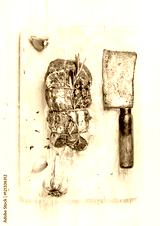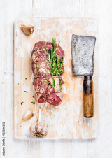 Raw uncooked roastbeef meat cut with rosemary, thyme and garlic and butcher knife on old white painted wooden background, top view, vertical composition