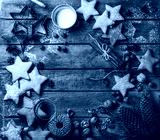 Christmas or new year background. Star shaped gingerbread cookies with sugar powder, nuts, cinnamon, anise, decorative rope, fir tree branch, pine cones on wooden background, top view, copy space