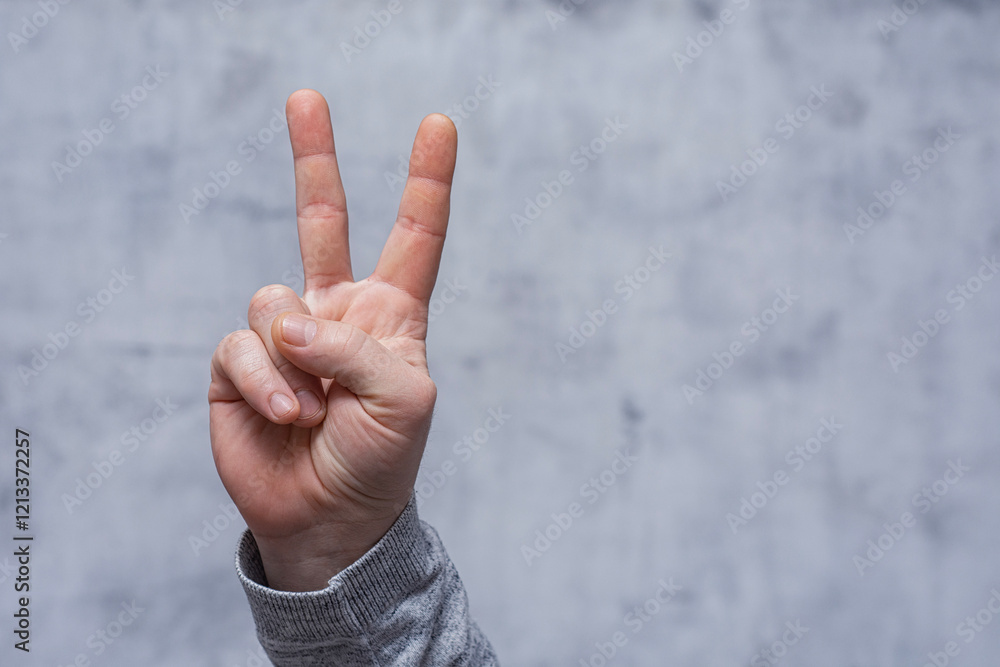 Man in a shirt showing gesture V means victory, peace sign or protest sign, close-up against a concrete wall.