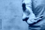 Close-up of a man in a shirt, making a hand grip with open palm against a concrete wall.