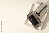 Black bottle and razor on white background, space for text