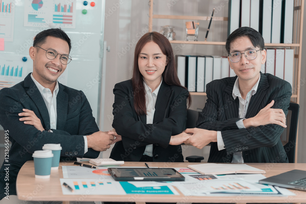 Shaking hands of people working in the office Business deals, partnerships, and we are hiring a female HR manager who is ready to welcome any new business start-up.