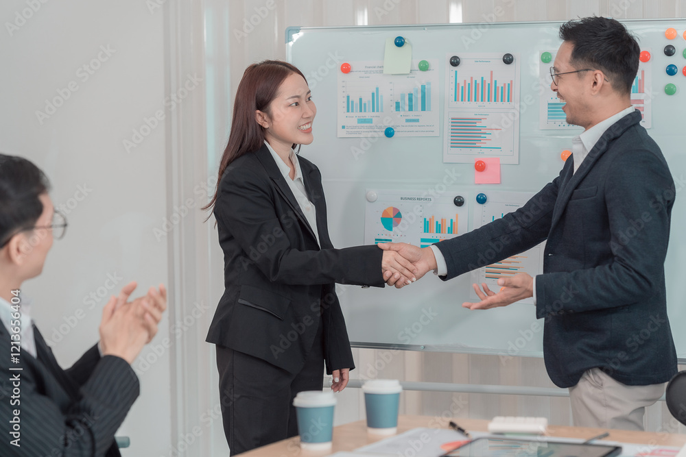 Shaking hands of people working in the office Business deals, partnerships, and we are hiring a female HR manager who is ready to welcome any new business start-up.