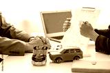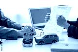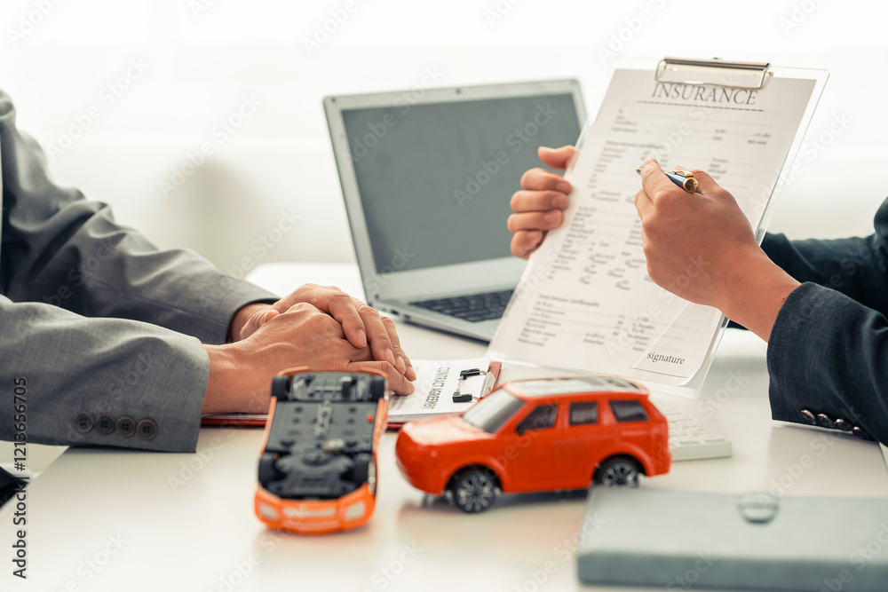 Insurance agent and red toy car on table Transportation financial cost management planning Concept of car insurance business