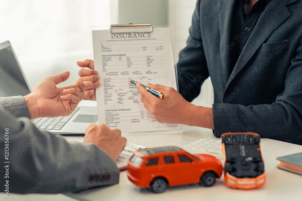 Insurance agent and red toy car on table Transportation financial cost management planning Concept of car insurance business
