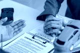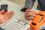 Insurance agent and red toy car on table Transportation financial cost management planning Concept of car insurance business