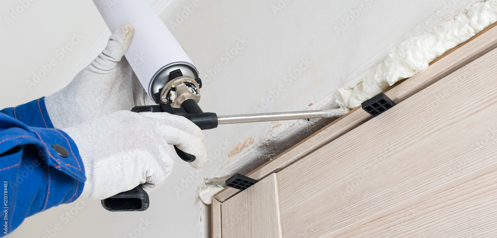 applying foam with a gun into the space between the door frame of an interior door, hands of a master