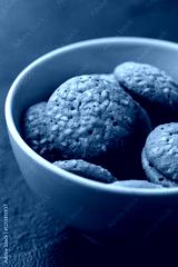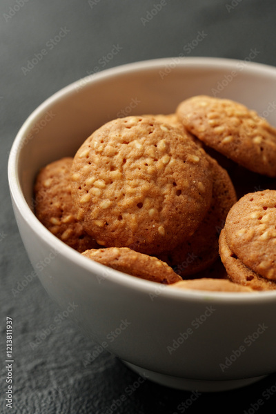 Freshly baked cookies in a white bowl on a dark textured surface during afternoon light