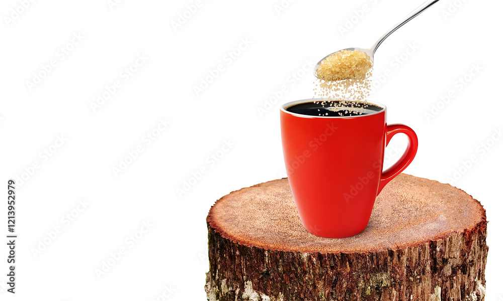 Red coffee mug on natural tree stump.
