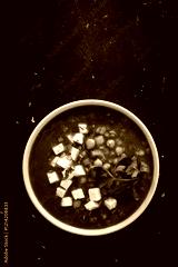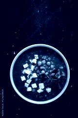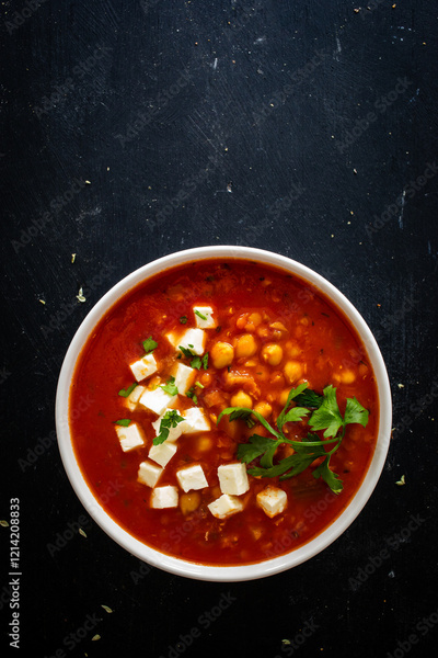 Lentil and tomato soup with feta cheese on black table