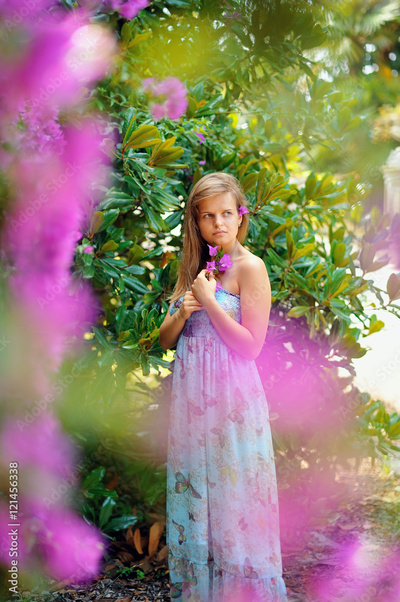 romantic girl in garden with flower bougainvillea