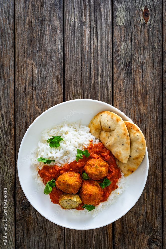 Butter chicken curry meatballs with rice and naan bread on wooden table