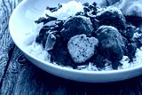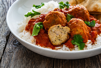 Butter chicken curry meatballs with rice and naan bread on wooden table