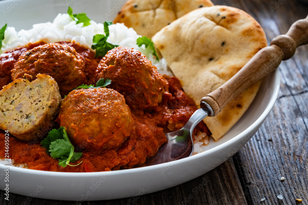 Butter chicken curry meatballs with rice and naan bread on wooden table