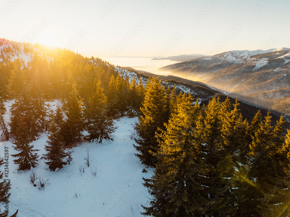 Winter hiking to Certovica in Low Tatras National park is full of beautiful views. Sunset in Slovakia mountains.