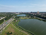 aerial view of new york city skyline from corona flushing meadows park with dramatic dark sky coming clouds at sunset (lake distant skyscrapers of manhattan far away) horizon silhouette shadow queens