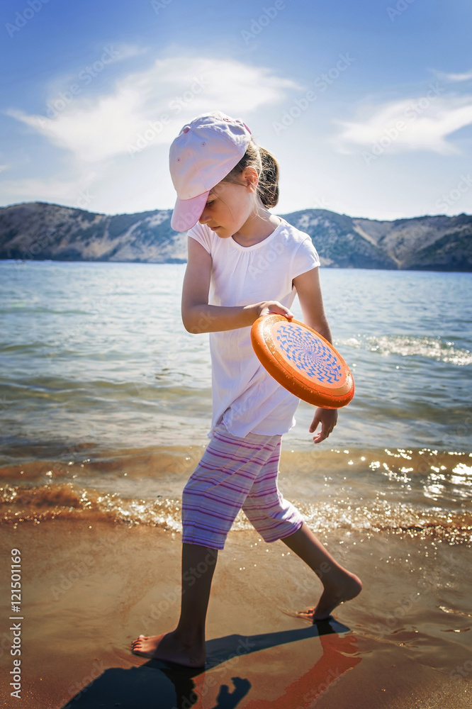 Six years old girl playing with plastic frisbee on a beach. Croatia, Rab island.