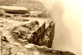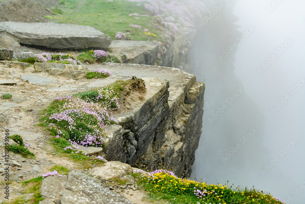 Pink thrift flowers blossoming on the Cliffs of Moher, one of the most popular tourist destinations in Ireland. Foggy view of widely known attraction on Wild Atlantic Way in County Clare.