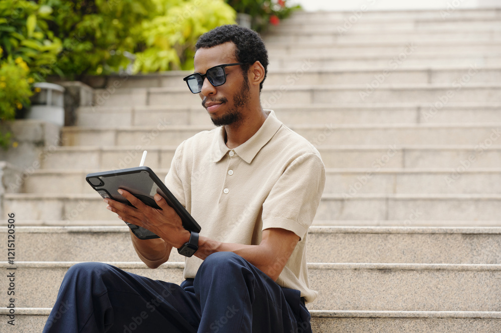 African American man in sunglasses sitting on stairs outdoors and using digital tablet