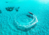 Aerial view of the speed boat in clear azure water on summer sunny day. Top drone view of fast floating yacht in ocean ocean. Travel in Maldives. Tropical seascape with motorboat on blue sea. Travel