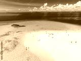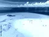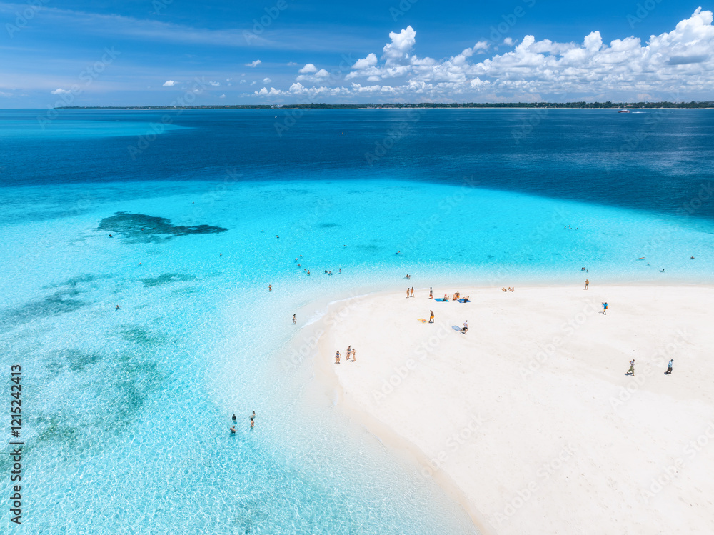 Aerial view of Nakupenda island, sandbank in ocean, white sandy beach, blue sea during low tide on sunny summer day. Zanzibar. Top view of sand spit, clear water, people, sky with clouds. Tropical