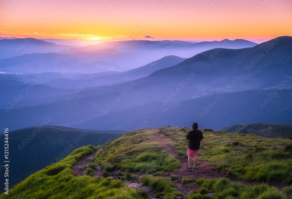 Man on the top of mountain Goverla, Ukraine. Hill with green grass and beautiful mountain valley at sunset in summer. Landscape with sporty man, hils in fog, orange sky at twilight. Hiking. Spring