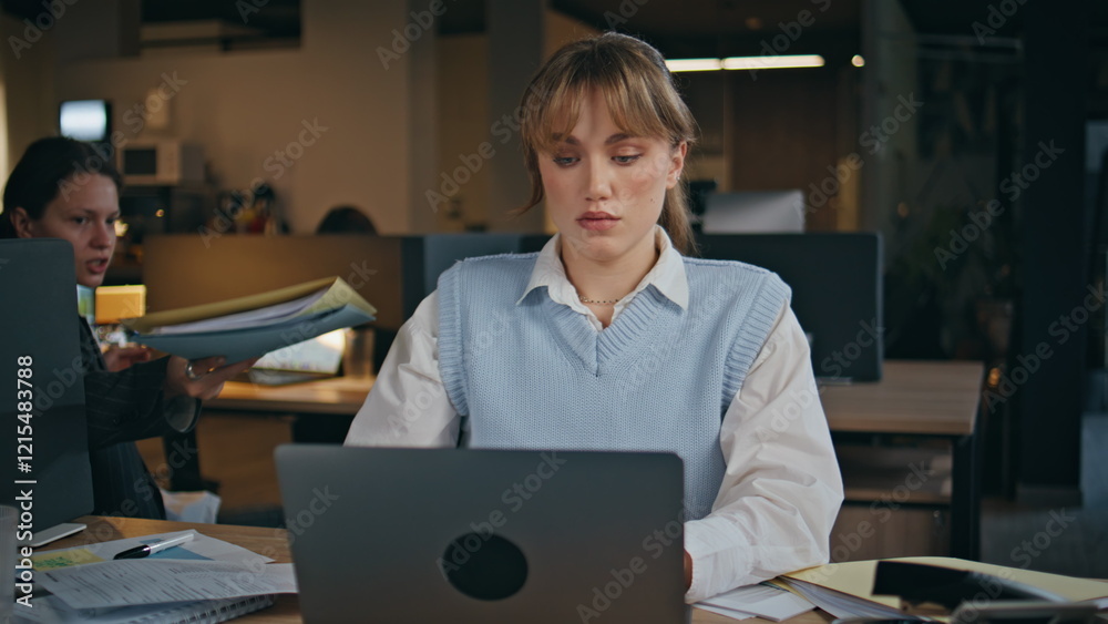 Lady worker examining documents corporate office table closeup. Woman paperwork