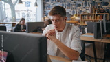 Thoughtful businessman staring computer at buro closeup. Man looking solution