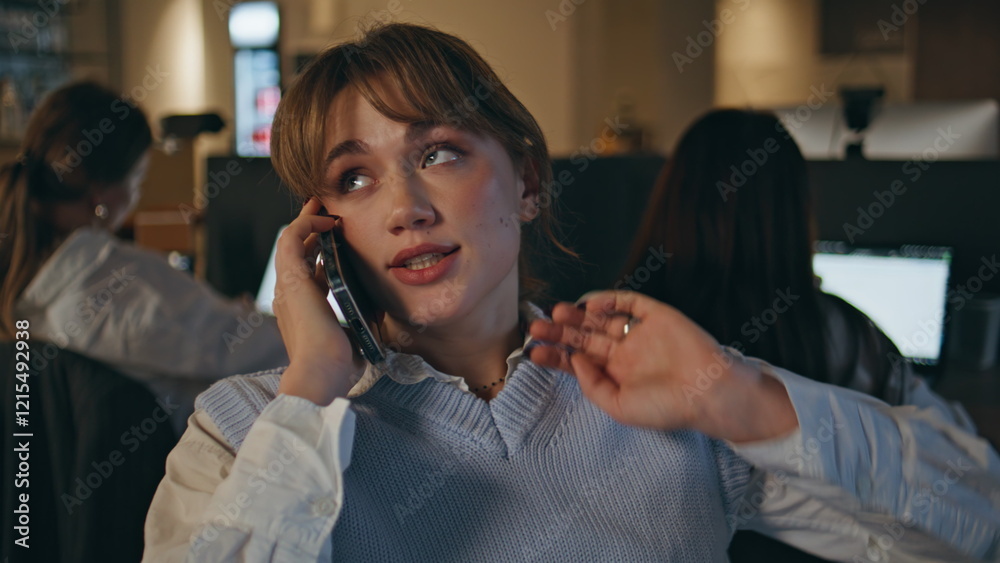 Relaxed employee calling mobile phone evening office closeup. Woman stretching