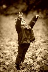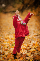 Little girl in red coat at scenic fall park. Baby wearing knitted cap standing over foliage background. Toddler child playing with yellow autumn leaves. Portrait of cute funny child outside.