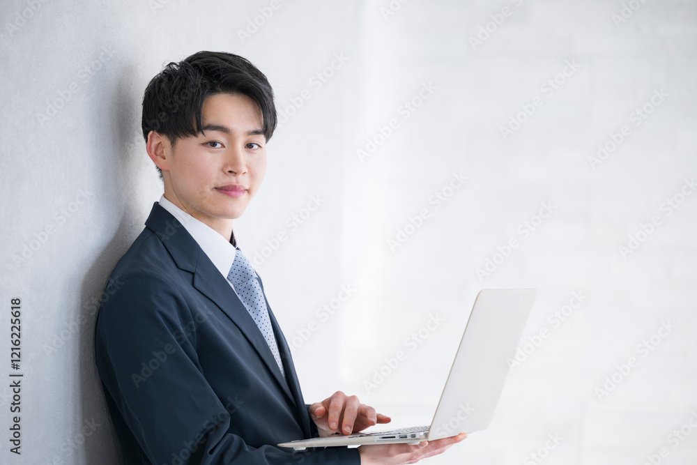 パソコンを持つ若い男性 新入社員などのイメージ 笑顔のカメラ目線