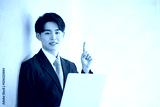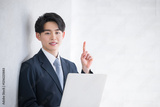 パソコンを持つ、ポイントの指差しの若い男性 新入社員などのイメージ 笑顔のカメラ目線