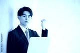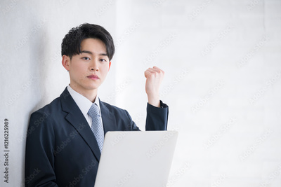 パソコンを持ってガッツポーズの若い男性 新入社員などのイメージ 真剣な表情