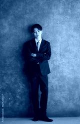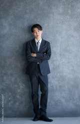 濃いグレーバックの背景にスーツで立つ20代の若い男性の全身のカメラ目線