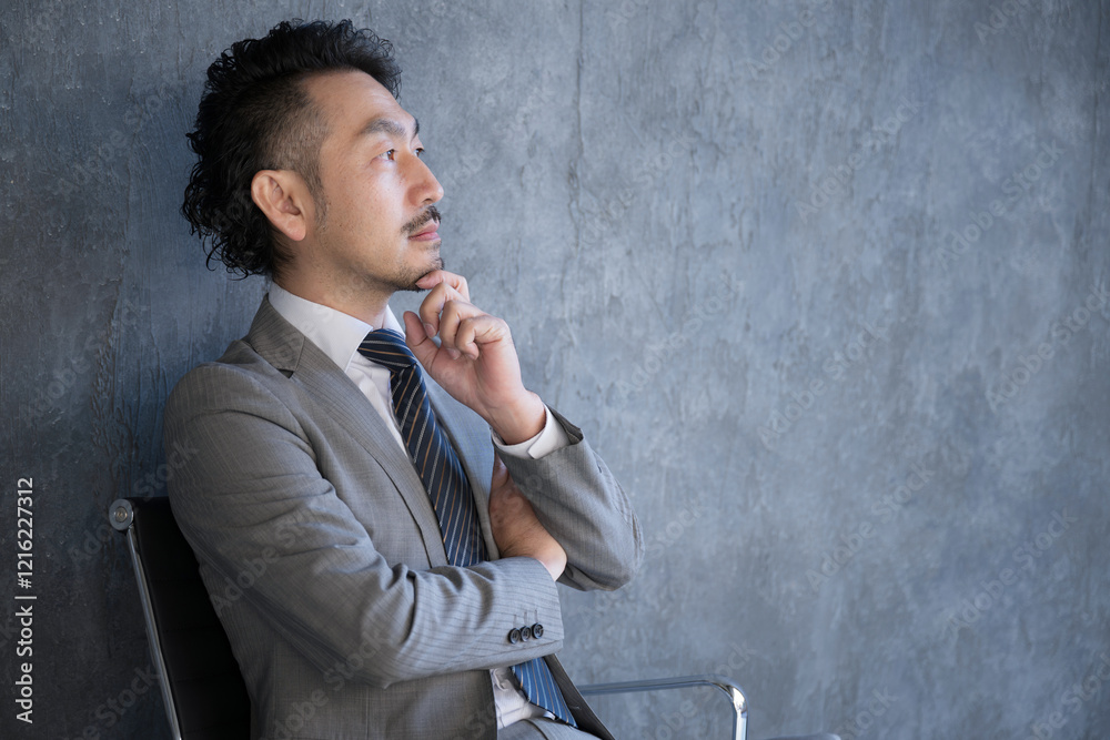 椅子に座って考えるスーツを着たビジネスマン 成功や目標、戦術や戦略を練るイメージの横顔