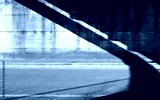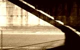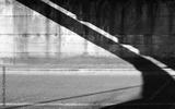 Grunge concrete wall at the entry of a road tunnel stained with moss, lichens and erased graffiti . Sidewalk and asphalt road in front. Background for copy space.