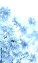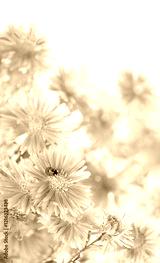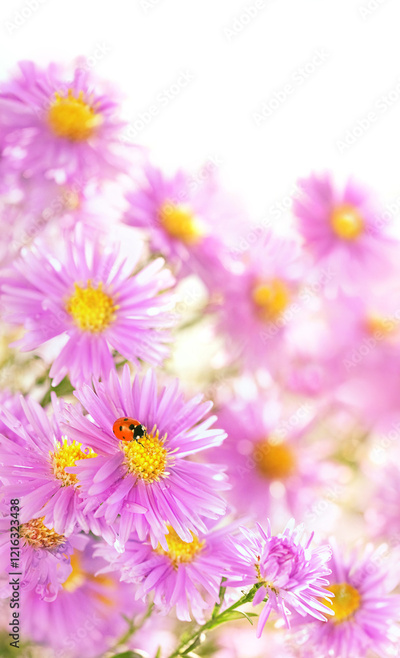 ladybug on purple flowers close up, floral background. gentle artistic image of wild floral nature. Beautiful scene with Michaelmas daisies, autumn seasonal flowers. soft focus