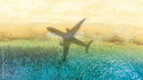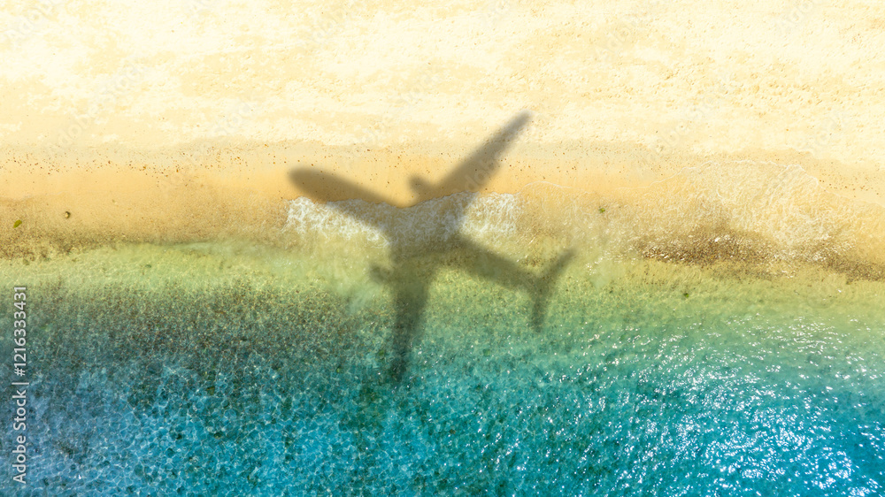 Aerial view of shadow passenger plane silhouette and sandy beach blue sea with waves at sea beach summer vacation sea travel concept