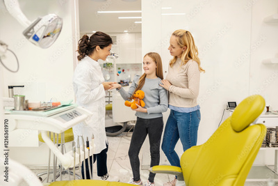 Mother and daughter talking to a dentist at dentist office during their visit.