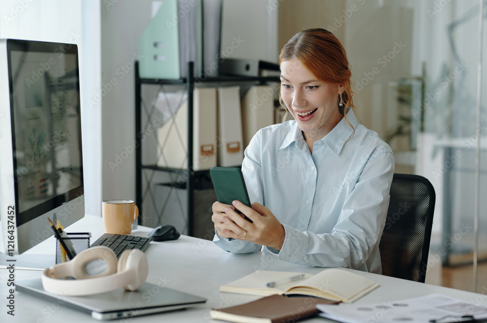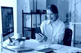 Smiling woman sitting at office desk, checking smartphone. There is a computer, notebook, and headphones on the desk with office shelves in the background