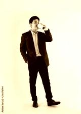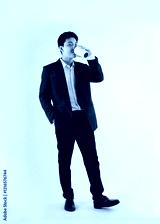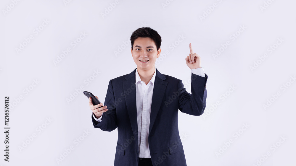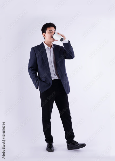 Full body image of a young Asian business man drink coffe and posing on a white background