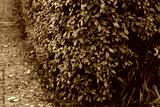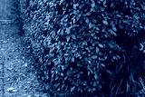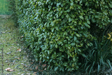 Evergreen cherry laurel hedge in the garden on winter season. Detail of Prunus laurocerasus bush