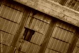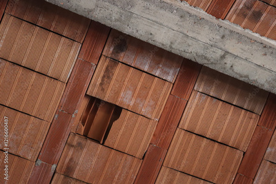 Outdoor view of a agricultural shed roof made with perforated bricks with damage